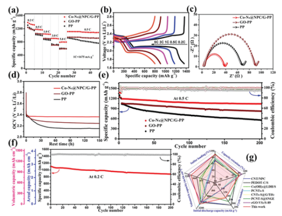 Figure 7.a) PP、GO-PP和Co-Nx@NPC/G-PP隔膜的聚硫化物滲透測(cè)量,顯示U型玻璃瓶中多硫化物從左側(cè)向右側(cè)擴(kuò)散;b) Co-Nx@NPC/G-PP隔膜的電池結(jié)構(gòu)示意圖,該隔膜對(duì)聚硫化物具有化學(xué)吸附和催化作用。 相關(guān)研究成果于2019年中國(guó)科學(xué)院福建物質(zhì)結(jié)構(gòu)研究所Ruihu Wang課題組,發(fā)表在Adv. Energy Mater.( https://doi.org/10.1002/aenm.201901609)上。原文:Separator Modified by Cobalt-Embedded Carbon Nanosheets Enabling Chemisorption and Catalytic Effects of Polysulfides for High-Energy-Density Lithium-Sulfur Batteries