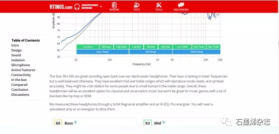 國(guó)外名牌頻響檢測(cè)圖顯示普通靜電耳機(jī)最大的問(wèn)題就是低頻段滾落太大,導(dǎo)致在100hz以下的低頻會(huì)有一種量感上的的缺失,網(wǎng)站在下面的一段話也說(shuō)明了這一點(diǎn)。這也是靜電耳機(jī)很難解決的一個(gè)問(wèn)題。不過(guò)好在我們用的石墨烯振膜在測(cè)試中幾乎完美的克服了低頻段的問(wèn)題,這說(shuō)明了石墨烯靜電耳機(jī)的優(yōu)勢(shì)。