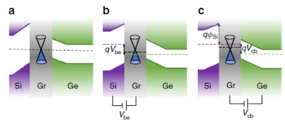 Figure 4. Si-Gr-Ge晶體管的能帶圖。(a)無施加偏壓下的能帶圖,(b)給發(fā)射結施加一個大于零的正向偏壓時的能帶圖,(c)給集流體結施加一個大于零的反向偏壓時的能帶圖。?