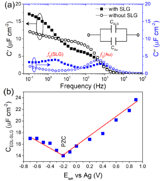 Figure 2.(a)有/無SLG涂覆的電極電容實部與虛部,在EMITFSI電解液中,施加電壓為0.2 V (相對于ref),插圖呈現(xiàn)了相應的等效電路圖,(b)Au涂覆石英共振器支撐SLG的CEDL?SLG−Ewe曲線。