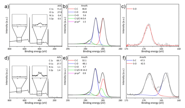 Figure 2. (a, d) XPS測量光譜與放大的F1s(左插圖)和N1s峰(右插圖),GO(頂行)和GO 1(底行)高分辨率的(b, e) C1s和(c, f) S2p光譜。