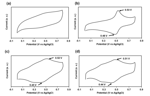 Figure 5. (a) GO,(b)苯醌,(c) GO 2,(d) GO 3的循環(huán)伏安曲線。