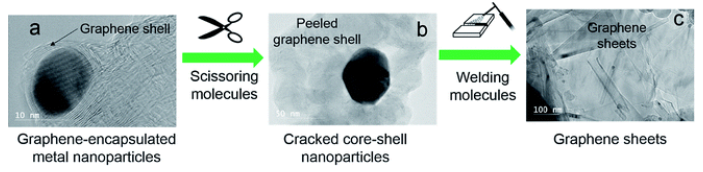 Fig. 1由石墨烯包裹的核-殼納米顆粒形成石墨烯基材料。(a)石墨烯包裹的金屬納米顆粒;(b)破碎的核殼納米顆粒;(c)石墨烯片。