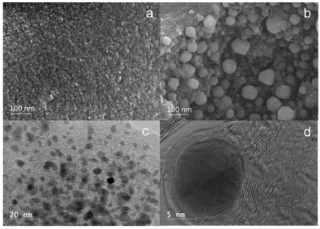 Fig. 3 在氬氣1000℃下催化熱分解鐵-木質(zhì)素前驅(qū)體的(a,b) SEM和(c,d) HRTEM圖。
