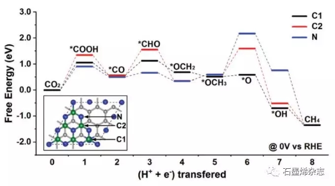 Figure 2. C3N4/NG不同位點上CO2還原生成CH4的自由能圖,插圖顯示了C3N4/NG的C1,C2,N位點。