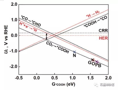 Figure 4. CRR重要步驟(黑實線)和HER兩個重要步驟(紅實線)的極限電壓與*COOH結(jié)合自由能的函數(shù)關(guān)系。