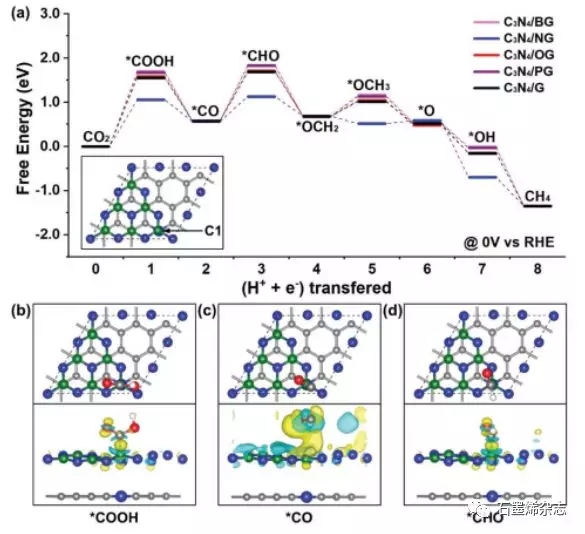 Figure 1. (a)不同雜化催化劑用于CO2還原生成CH4過程的自由能圖,(b-d)碳鍵合中間產(chǎn)物(分別是*COOH, *CO, *CHO)的最優(yōu)幾何結(jié)構(gòu)以及電子轉(zhuǎn)移過程。