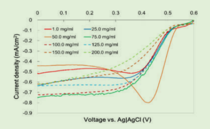 Figure 6. 不同濃度的改性BOD酶陰極電流密度(溶液:MBS, pH 7)。