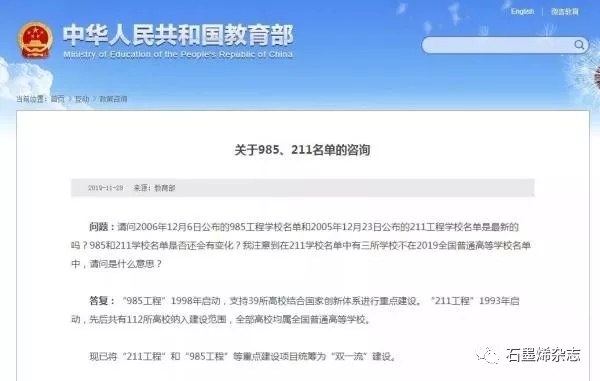 教育部對關(guān)于985、211名單咨詢的回復(fù)
