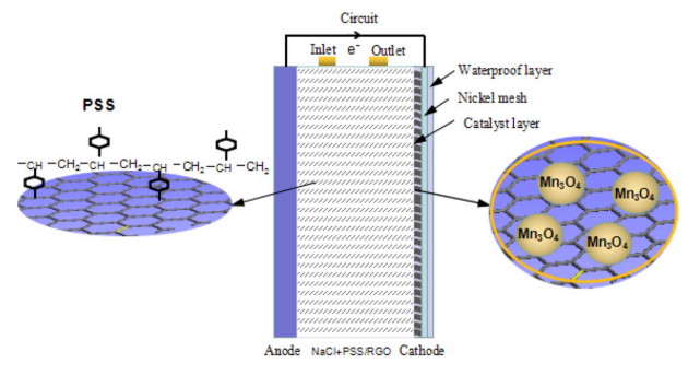 4納米復合材料作為空氣電極催化劑,在3.5%NaCl+PSS/RGO溶液中鎂空氣電池的結構。
