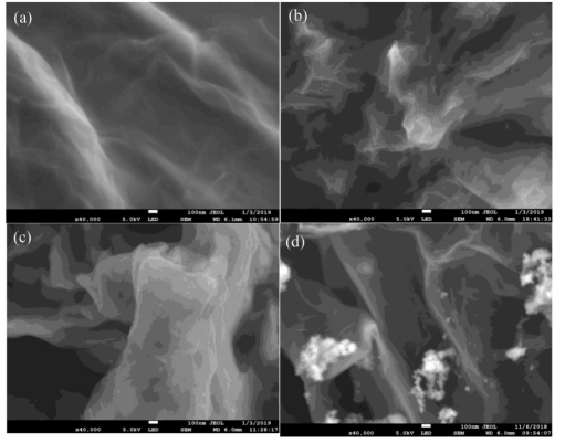 Figure 2. GO(a),RGO(b)和PSS/RGO(c)和RGO/Mn3O4納米復合材料(d)的SEM