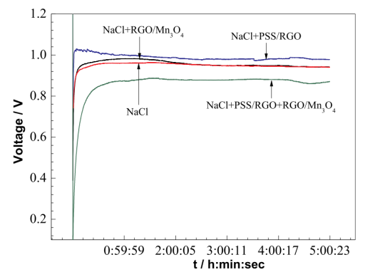 4納米復合材料為正極催化劑組織了鎂-空氣電池。通過X射線衍射、掃描電鏡和傅里葉變換紅外分光光度計對poly(4-苯乙烯磺酸鈉)/還原氧化石墨烯和還原氧化石墨烯/Mn