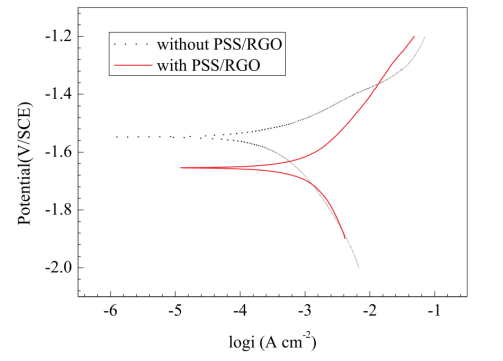 Figure 4. Mg-6wt%Al-1wt%In在3.5%NaCl和3.5%NaCl+1%PSS/RGO溶液中的極化曲線。