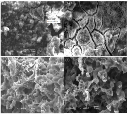 Figure 5. Mg-6wt%Al-1wt%In合金在不同溶液中放電后的SEM:在清洗腐蝕產(chǎn)物中的3.5%NaCl(a)和3.5%NaCl+1%PSS/RGO(b)中以及清洗腐蝕產(chǎn)物3.5%NaCl(c)和3.5%NaCl+1%PSS/RGO(d)