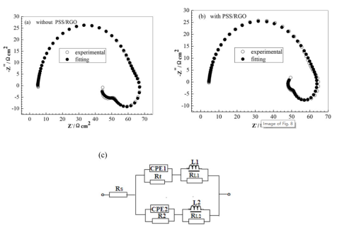 Figure 6. Mg-6wt%Al-1wt%In在3.5%NaCl溶液(a),3.5%NaCl+1%PSS/RGO溶液(b)中的EIS光譜和EIS的等效電路(c)。