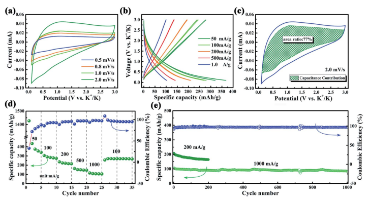2/RGO作為陽(yáng)極材料,對(duì)Li離子和K離子電池均具有高容量,顯著的倍率能力和長(zhǎng)循環(huán)性能。優(yōu)異的電化學(xué)性能歸因于小粒徑(15–25 nm)和RGO提供的電子傳輸通道,以及離子擴(kuò)散路徑短。此外,RGO激勵(lì)了電容性貢獻(xiàn),從而提高了容量并改善了倍率性能。同時(shí),通過(guò)定量動(dòng)力學(xué)分析研究了Li/K離子存儲(chǔ)的電化學(xué)動(dòng)力學(xué)。這項(xiàng)工作證明了引入電容容量以實(shí)現(xiàn)快速離子存儲(chǔ)并改善循環(huán)穩(wěn)定性的可能性,為設(shè)計(jì)用于金屬離子電池的高效電極提供了新策略。
