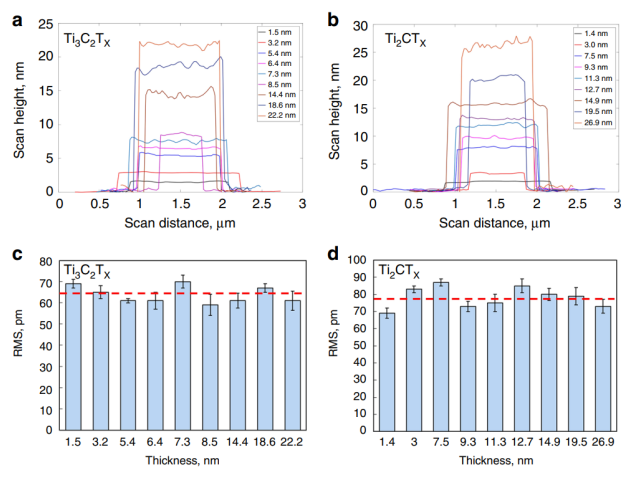 x膜的AFM線掃描(a,b)和相應(yīng)的RMS值(c,d)