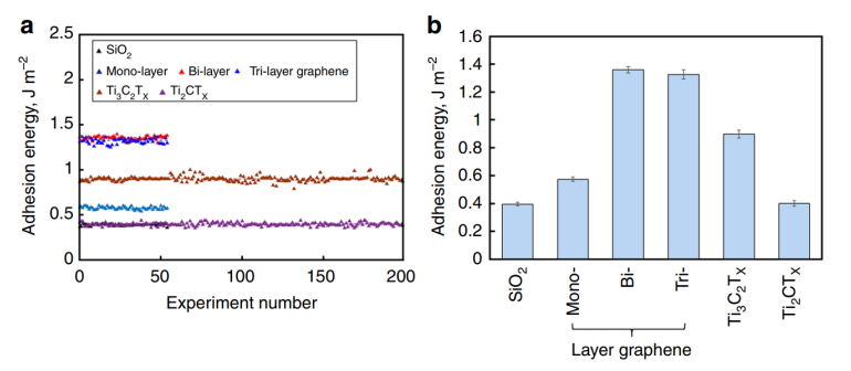 2涂層的硅球形尖端的附著力。應(yīng)用Maugis-Dugdale理論,同時考慮了表面粗糙度,將AFM測得的粘附力轉(zhuǎn)換為粘附能。將獲得的粘附能與單層、雙層和三層石墨烯以及SiO