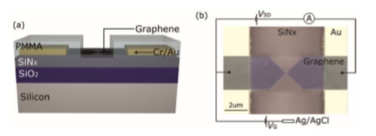 我們分析了液體門控、室溫石墨烯量子點(diǎn)中的噪聲。這些設(shè)備顯示非常大的噪聲振幅。通過考慮施加的源極-漏極和柵極電勢的波動(dòng),根據(jù)電荷噪聲模型來解釋觀察到的噪聲。我們發(fā)現(xiàn),液體環(huán)境和基質(zhì)對觀測到的噪聲影響很小,因此將噪聲歸因于無序石墨烯邊緣的電荷捕獲/釋放。單個(gè)電荷的捕獲/釋放可以通過控制器件進(jìn)行調(diào)整,從而導(dǎo)致測量電流中穩(wěn)定的兩級(jí)波動(dòng)。這些結(jié)果對電子石墨烯納米器件在單分子生物傳感中的應(yīng)用具有重要意義。