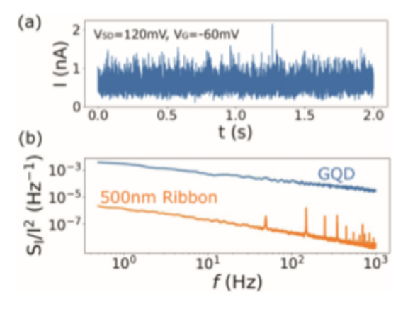 Fig. 3 (a) VSD = 120mv, VG = −60mv時(shí)的電流-時(shí)間跟蹤實(shí)例。(b)噪聲頻譜的石墨烯量子點(diǎn)和寬500 nm,長10μm石墨烯絲帶。