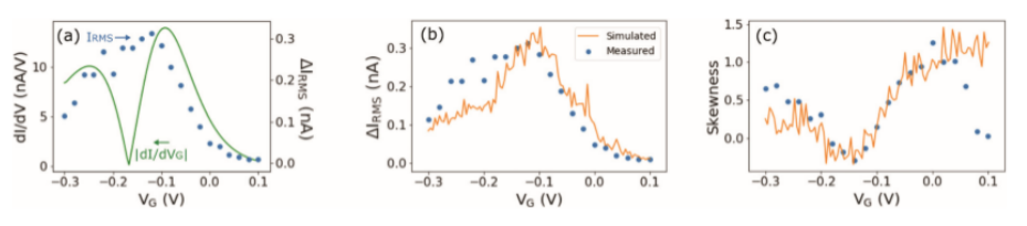 Fig. 4 (a) VSD = 120mv(藍(lán)色圓點(diǎn))時(shí)的RMS電流噪聲與跨導(dǎo)(綠色線條)的關(guān)系。(b) VSD = 120mv時(shí),測量和模擬RMS電流噪聲作為VG的函數(shù)。(c)在VSD = 120 mV時(shí),測量和模擬I-t道與VG的關(guān)系。