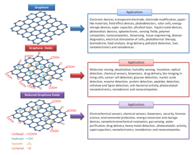 Figure 1. 石墨烯及其衍生物(氧化石墨烯和還原的氧化石墨烯)的應(yīng)用領(lǐng)域。