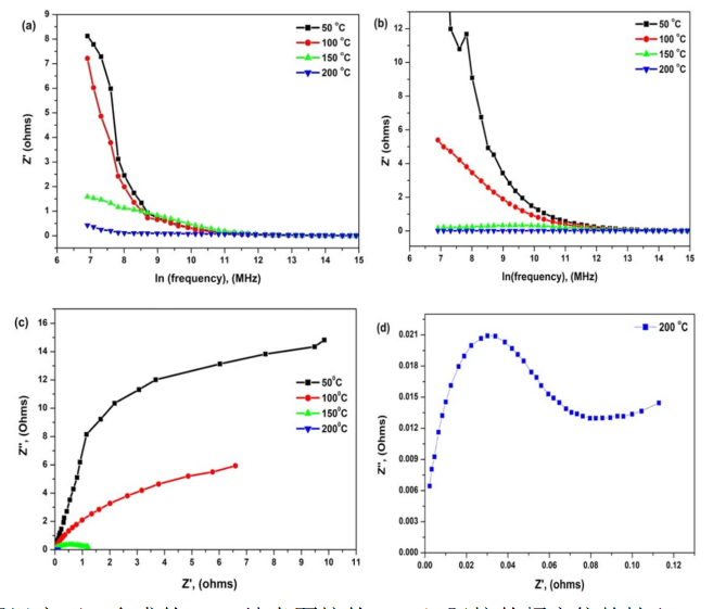 Figure 5. 合成的rGO封裝CuS復(fù)合材料,在不同溫度下的(a,b)阻抗的頻率依賴性和(c,d)Cole-Cole圖