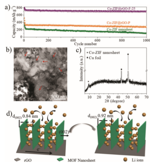 Figure 5. a) Co-ZIF納米片,Co-ZIF@rGO-P, Co-ZIF@rGO-F-25在較高電流密度為1 A g−1時(shí)的長期循環(huán)性能;循環(huán)測試后Co-ZIF@rGO-F-25負(fù)極的b) TEM圖像,c) XRD譜; d) Co-ZIF @rGO-F-25中Co-ZIF納米片的平面間距的示意圖。