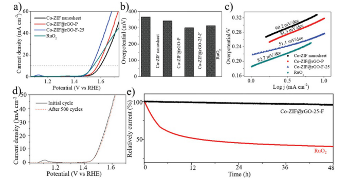 Figure 4. a) Co-ZIF@rGO-F-25在電流密度0.1 A g−1時(shí)恒流充放電曲線;b) Co-ZIF納米片、Co-ZIF@rGO-P、Co-ZIF@rGO-F-25在0.1 A g−1電流密度下的循環(huán)性能;c) Co-ZIF@rGO-F-25在不同電流密度下的恒電流充放電曲線;d) Co-ZIF納米片,Co-ZIF@rGO-P,Co-ZIF@rGO-F-25的倍率性能。