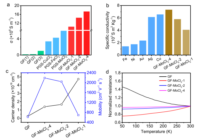 Figure 3. a)與純GF和先前文獻中報道的一些金屬氯化物插層的商用石墨片(PGS)相比,GF-MoCl5的高穩(wěn)定電導率;b)比較GF-MoCl5和幾種金屬導體的比電導率;c)霍爾效應測量GF和GF-MoCl5的載流子密度和遷移率;d)GF和GF-MoCl5歸一化電阻的溫度依賴性