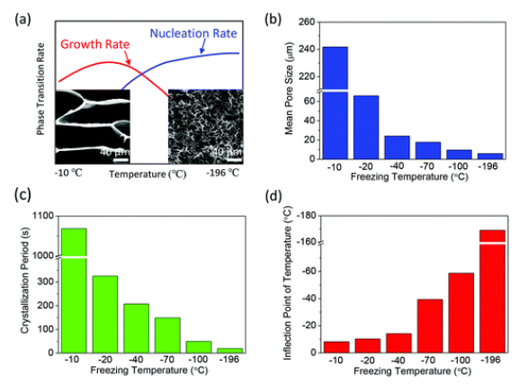 Fig. 4 (a)成核和生長速率隨過冷度的變化;(b)溫度拐點、(c)結(jié)晶周期、(d)平均孔徑隨凍結(jié)溫度的變化。