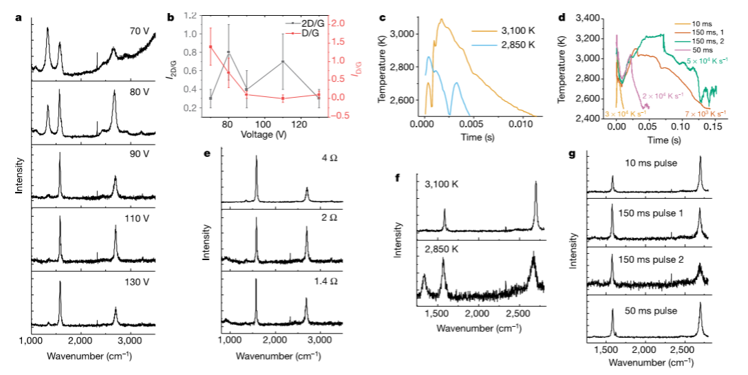 Fig. 2 FJH關(guān)鍵參數(shù)。a,CB-FG的拉曼光譜。b,CB-FG在不同電壓下的I2D/G和ID/G比。c,CB-FG在不同溫度下反應(yīng)的時(shí)間-溫度圖。 d,CB-FG在不同的持續(xù)時(shí)間內(nèi)反應(yīng)的時(shí)間-溫度圖。e、不同壓縮比下的CB-FG的拉曼光譜。f, c中CB-FG樣品的拉曼光譜。g,d中CB-FG樣品的拉曼光譜。