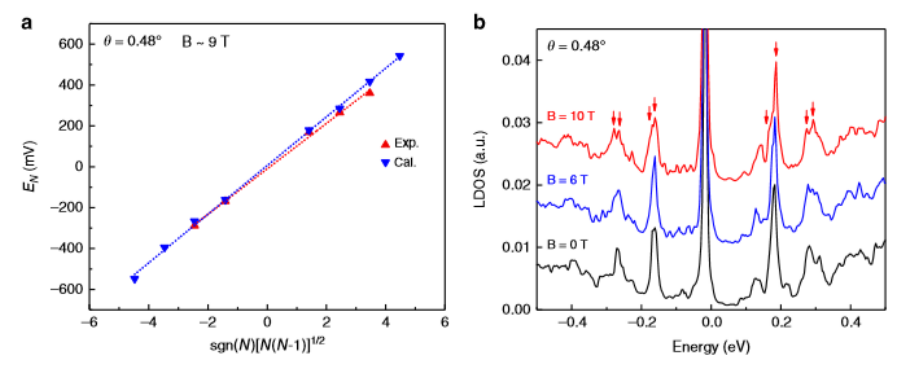 具有適當(dāng)應(yīng)變的單層或雙層石墨烯有望具有高對(duì)稱性的周期性偽磁場(chǎng),但迄今為止,對(duì)此類偽磁場(chǎng)仍缺乏令人信服的證明,尤其是對(duì)雙層石墨烯。在此,我們報(bào)告了大面積、周期性偽磁場(chǎng)存在的明確實(shí)驗(yàn)證據(jù),其與渦旋晶格、低角度雙螺旋分子層石墨烯的莫爾條紋表現(xiàn)出可通約性。通過(guò)掃描隧道顯微鏡/光譜學(xué)觀察,該偽磁場(chǎng)強(qiáng)度大,可以將大量的狄拉克電子限制在循環(huán)定位的偽朗道能級(jí)中,并且通過(guò)緊密結(jié)合計(jì)算也得到了證實(shí)。我們進(jìn)一步證明,偽磁場(chǎng)的幾何形狀,振幅和周期性可以通過(guò)旋轉(zhuǎn)角和異應(yīng)變兩者進(jìn)行微調(diào)。總的來(lái)說(shuō),本研究極大地豐富了扭曲的雙層石墨烯,為探索新奇的物理現(xiàn)象(包括量子谷霍爾效應(yīng)和量子反常霍爾效應(yīng)),提供了一個(gè)強(qiáng)大的支持平臺(tái)。