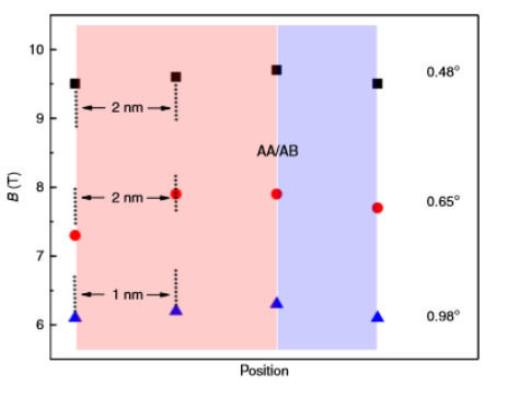 Fig. 5 不同扭角的TBGs在AA/AB交變區(qū)的擬合偽磁場(chǎng)。