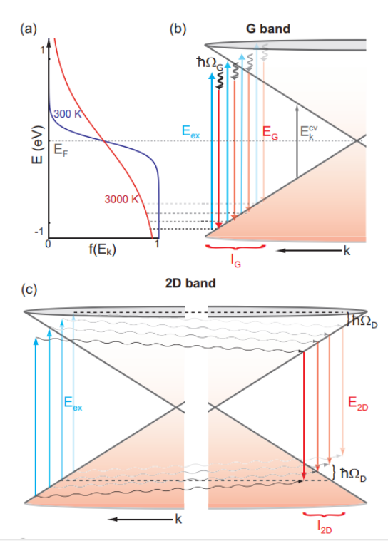 Figure 3.(a)在低(300 K)和高(3000 K)電子溫度下,電子的費(fèi)米-狄拉克分布。 (b,c)能級(jí)方案分別說(shuō)明了導(dǎo)致G和2D頻帶散射的過(guò)程。