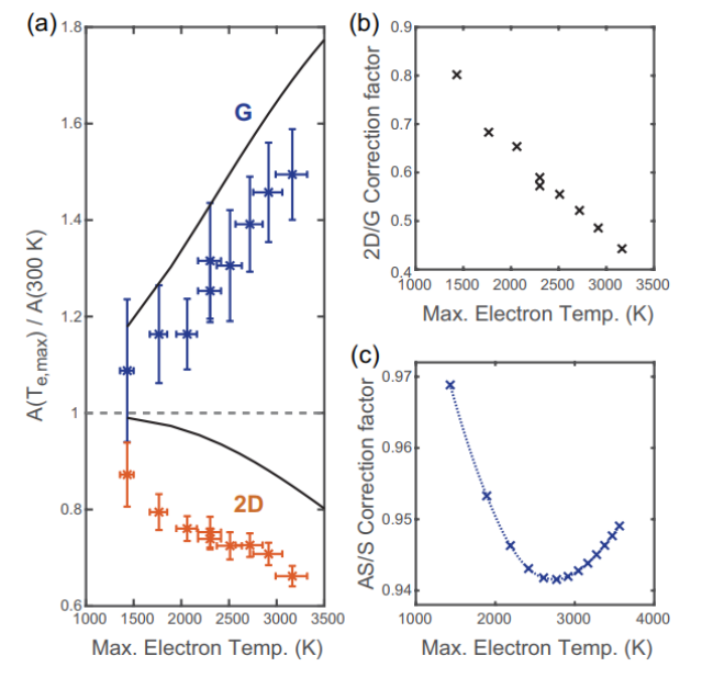 Figure 4. (a)G和2D波段拉曼散射區(qū)域的依賴性。(b)實(shí)驗(yàn)獲得的用于提高電子溫度的2D / G比的校正因子。(d)由于電子溫度控制干擾,對(duì)G波段的anti-Stokes/Stokes比的預(yù)測(cè)校正因子。