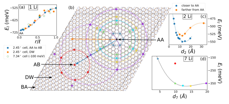 I。(b)在松弛的2.45°石墨烯電池中,六個Li原子圍繞第七個Li原子(黑色)排列成一個圓形,該第七個Li原子位于AA區(qū)域的中心。(c)成對Li嵌入劑中每個原子E
