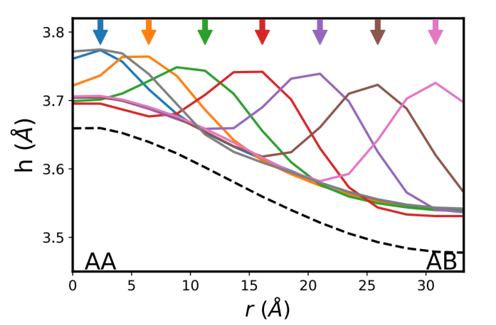 Figure 2. 以Å和AB區(qū)域之間的直線為中心,距離為r(Å)的5Å圓中,石墨烯層之間的平均間距h(Å)。