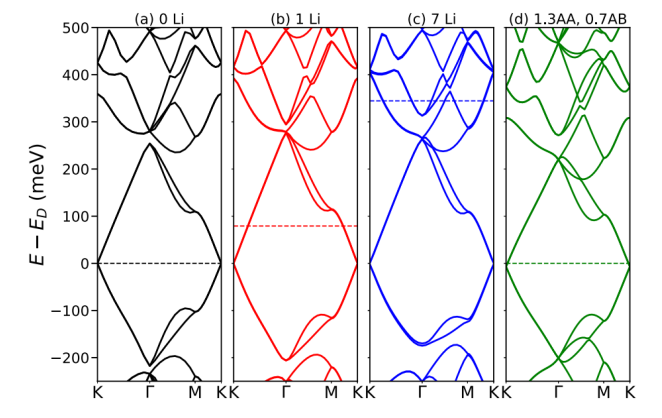 我們使用第一性原理電子結構計算,研究了鋰嵌入雙層扭曲石墨烯中的影響。為了對該系統(tǒng)進行建模,采用了相應的超晶胞,它們對應于7.34°和2.45°的扭曲角。從鋰吸收的能量學上,我們證明了對于低的Li濃度,嵌入劑聚集在AA區(qū)域中,密度是均勻分布的兩倍。Li原子提供給石墨烯層的電荷會改變能帶結構,這種能帶結構可以使用參數(shù)空間區(qū)域中經(jīng)過修改的層間耦合的連續(xù)模型定性地捕獲,但該參數(shù)空間尚未通過實驗或理論進行探索。因此,插入層和扭曲層的組合同時提供了對材料特性進行空間控制的手段,以及一個額外的旋鈕,可用來調節(jié)石墨烯扭曲雙層中的莫爾層物理特性,其潛在應用范圍從能量存儲和轉換到量子信息。