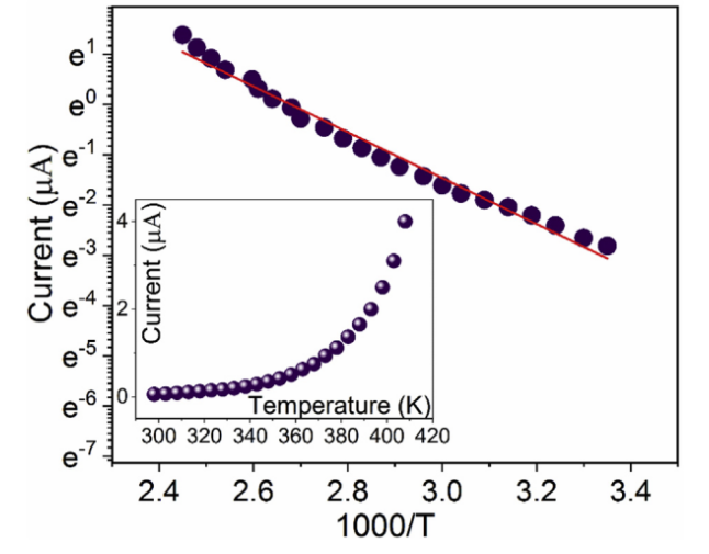 Figure 4. 對(duì)于黑暗條件下,在歐姆區(qū)域和2 V恒定電壓下,高真空下加熱RGO-ClAlPc納米復(fù)合材料,I-T特性和電流隨溫度的變化進(jìn)行了描述。