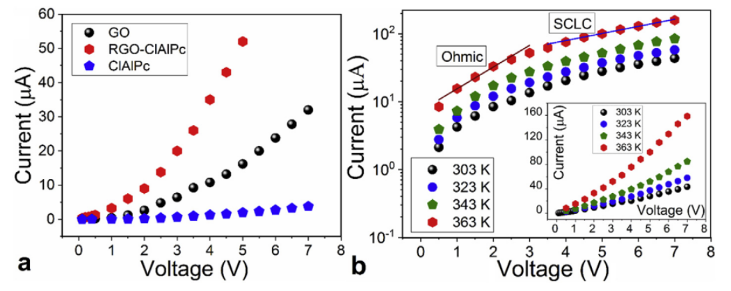 Figure 5. (a)在室溫下,比較RGO-ClAlPc納米復(fù)合材料、ClAlPc和GO的I–V特性。(b)在不同溫度下,器件的I–V特性。