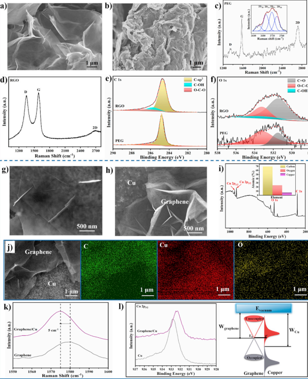 Figure 1. 滴落在硅片上的石墨烯分散體的SEM圖像:(a)PEG和(b)RGO。 在514.5 nm激光下激發(fā)的石墨烯的拉曼光譜:(c)PEG和(d)RGO,(c)中的插圖顯示了四個用于擬合PEG的2D峰的Lorentzians函數(shù)。PEG和RGO的XPS精細(xì)譜:(e)C 1s和(f)O 1s。 (g,h)石墨烯/銅異質(zhì)結(jié)構(gòu)的SEM圖像。(i)石墨烯/銅異質(zhì)結(jié)構(gòu)的XPS總譜以及各種元素的原子百分比。(j)石墨烯/銅異質(zhì)結(jié)構(gòu)的表面掃描圖片,包括碳,銅和氧的元素信息。k)G峰的拉曼光譜。l)在電沉積的銅襯底上摻雜石墨烯前后,Cu 2p
