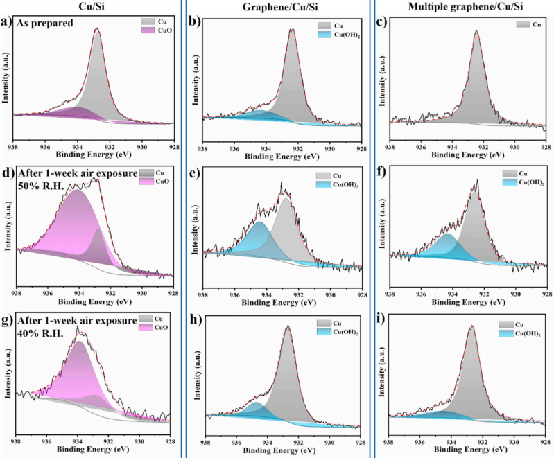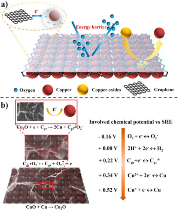 Figure 4. (a)本文提出的石墨烯/銅異質(zhì)結(jié)構(gòu)的抗氧化性和脫氧性作用機(jī)制。 (b)