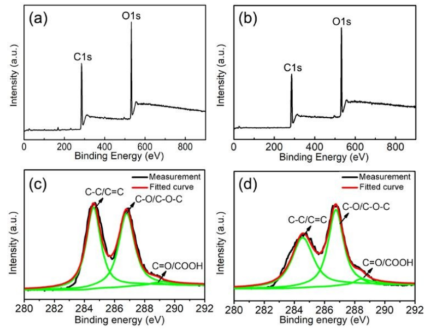 Figure 2. GO-1 (a,c) 和GO-2 (b,d) 的XPS全譜及C 1s 精細譜。