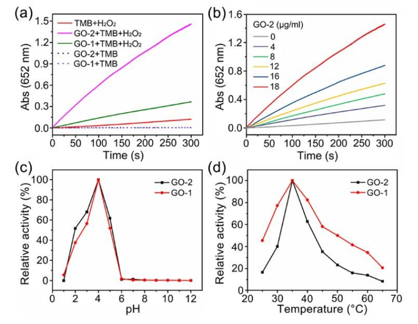 2反應溶液在652 nm處的吸光度隨時間變化的曲線。(b)在濃度范圍為0至18 μg/mL的區(qū)間內(nèi),GO-2的活性隨濃度變化曲線。進行GO催化的最佳pH(c)和最佳溫度(d)。
