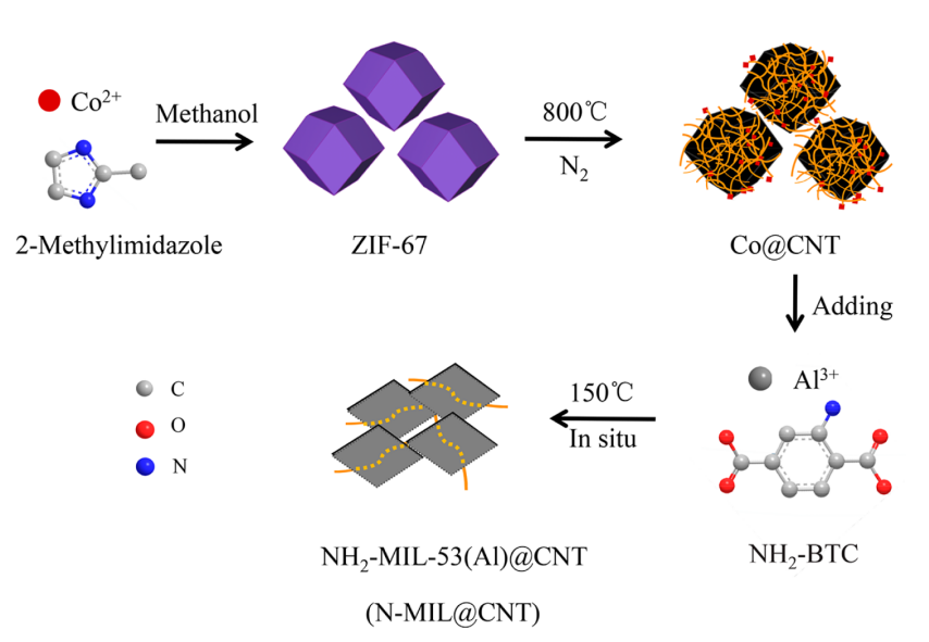 Scheme 1. 胺化的MIL-53(Al)@CNT復(fù)合吸附劑的制備過程示意圖。