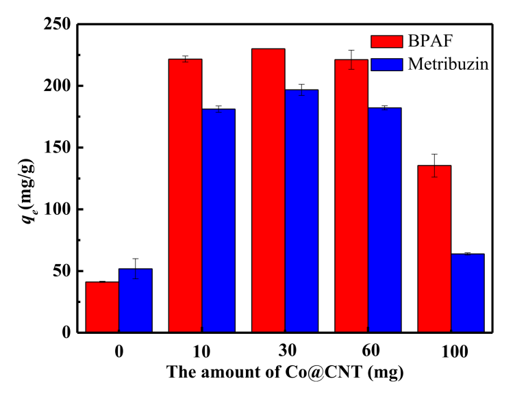 Figure 3. BPAF和嗪草酮吸附量與Co@CNT負載量的關(guān)系。