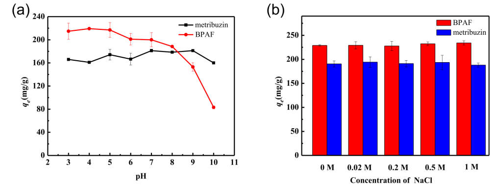 Figure 4. 兩種有機物在N-MIL@CNT上的吸附量與(a)pH值(T=298 K; t=5 h)和(b)離子強度的關(guān)系。