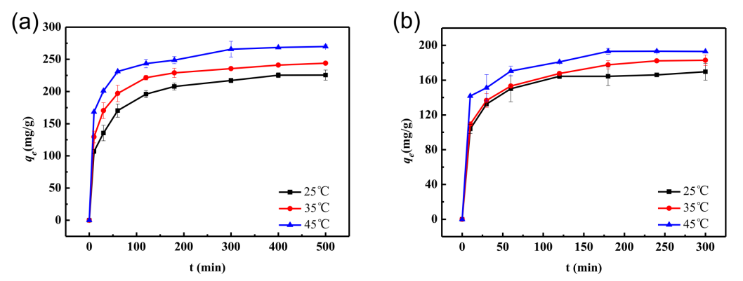 Figure 5. N-MIL@CNT在不同溫度下對(a)BPAF和(b)嗪草酮的吸附動力學(xué)。