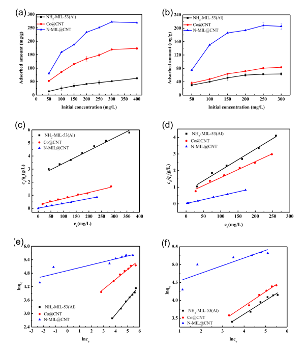 Figure 7.(a)BPAF和(b)嗪草酮的吸附等溫線(T = 298 K; t =5小時)。使用Langmuir模型擬合的(c)BPAF和(d)嗪草酮的吸附曲線。使用Freundlich模型擬合的(e)BPAF和(f)嗪草酮的吸附曲線。